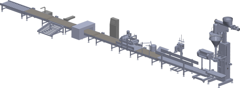 NO. 25KG大袋包裝生產(chǎn)系統 1 水平螺桿輸送機 2 充填機 3 熱封口機 4 皮帶輸送機 5 縫包機 6 倒包輸送帶 7 袋整平輸送機 8 重量檢測機 9 金屬檢測機 10 剔除輸送帶 11 滾筒輸送機 12 皮帶輸送機 13 噴碼機 14 滾筒輸送機